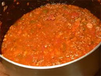 3. Bring to a boil, then lower the heat so the sauce is bubbling. Cook stirring occasionally, until the sauce is dense, but juicy and a rich dark-red color. This take about 2 to 3 hours - the longer you cook it, the better it will become. While the sauce is cooking, add hot water as necessary to keep the meats and vegetables covered.