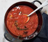 Ingredients: 1/4 cup extra-virgin olive oil 1 small onion, chopped 1/4 cup carrots, peeled & finely shredded 1/4 cup celery with leaves, finely chopped 2 (35 oz.) cans peeled Italian tomatoes, seeded & lightly crushed by hand, with their liquid 2 dried bay leaves Salt & hot red pepper flakes, to taste