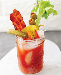 Ingredients: 2 oz. vodka 4 oz. Bloody Mary Mix (recipe on mixers page) 1 celery stalk, for garnish Olives, for garnish 1 strip crispy bacon Pickled vegetables, for garnish (optional)