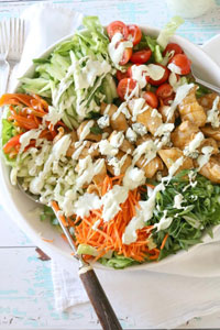 Ingredients: 3 cups salad of your choice 1 chicken breast 1/2 cup shredded cheese of your choice Buffalo wing sauce of your choice Ranch or blue cheese dressing
