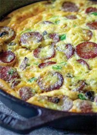 Ingredients: 8 large eggs 1/4 cup heavy whipping cream 1 cup shredded cheddar cheese Pinch of salt & ground black pepper 12 oz. smoked sausage, sliced 1 cup white mushrooms, diced 1/4 cup green onions, sliced, plus more for garnish
