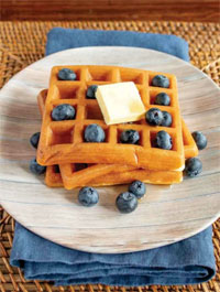 4. Carefully remove the waffle and repeat the cooking process with the rest of the batter. Serve with syrup, blueberries, and butter, if desired. Leftovers can be stored in the refrigerator for up to 5 days. Reheat in a toaster.
