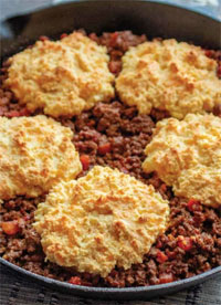 5. Drop the biscuit topping mixture by the large spoonful onto the chili beef mixture in the skillet.