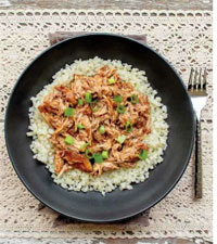 5. Return the chicken to the slow cooker and stir to coat the meat in the sauce. Serve over riced-cauliflower and garnish with slice green onions, if desired.